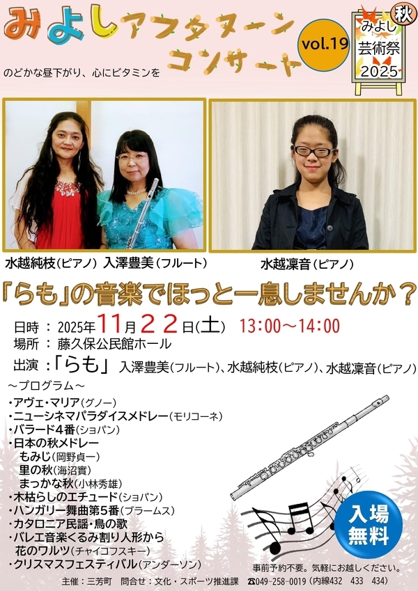 令和7年10月15日(水曜日)みよしアフタヌーンコンサートvol.17「七里香(オカリナ・ひょうたん笛・ピアノ)」