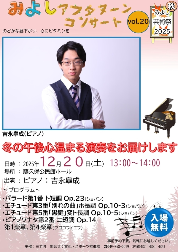 三芳町では、誰もが気軽に芸術文化に親しみ、出会うことのできる「憩いの場」をつくるため、みよしアフタヌーンコンサートを月1回程度、開催します。