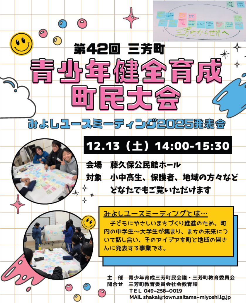町内の中学生から大学生が集まり、まちの未来について話しあう「みよしユースミーティング2025」の発表会を行います。子どもから大人までどなたでもご覧いただけますのでお誘いあわせの上、ぜひご来場ください。